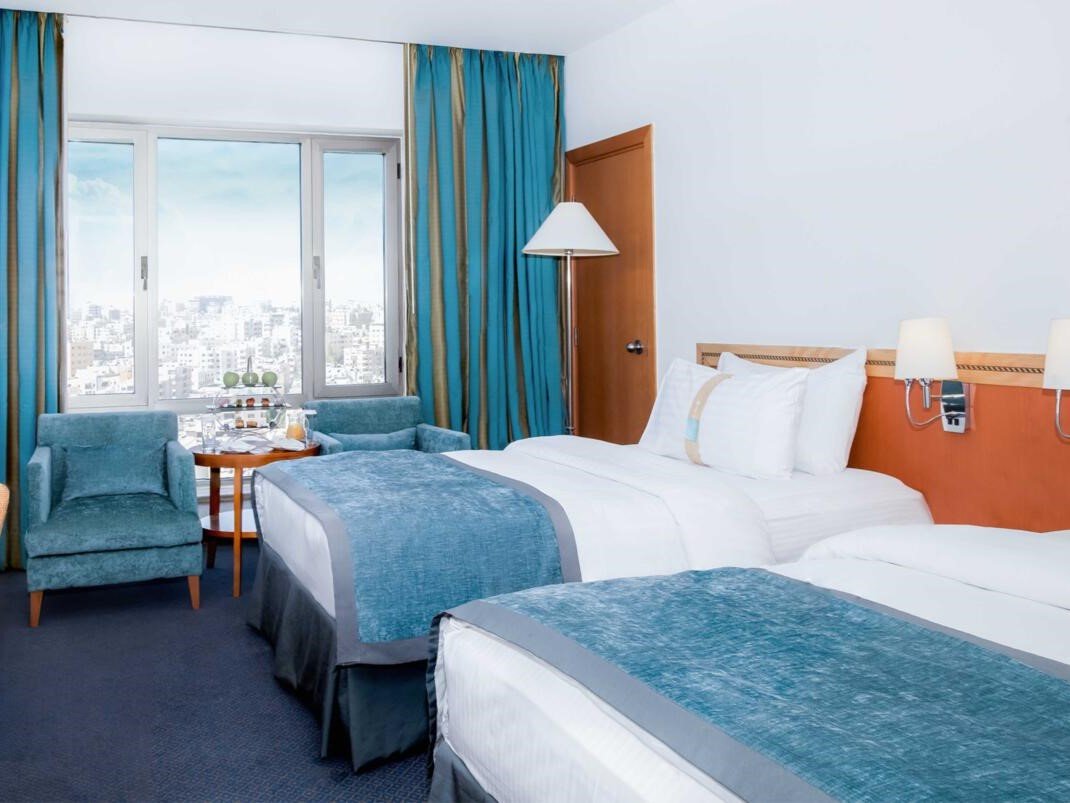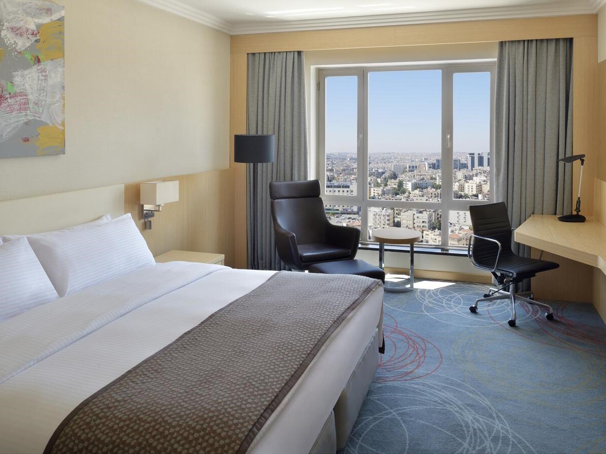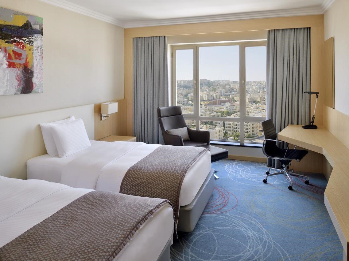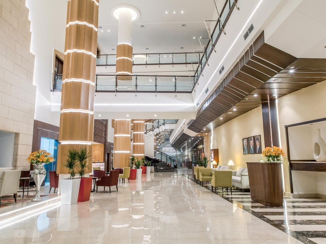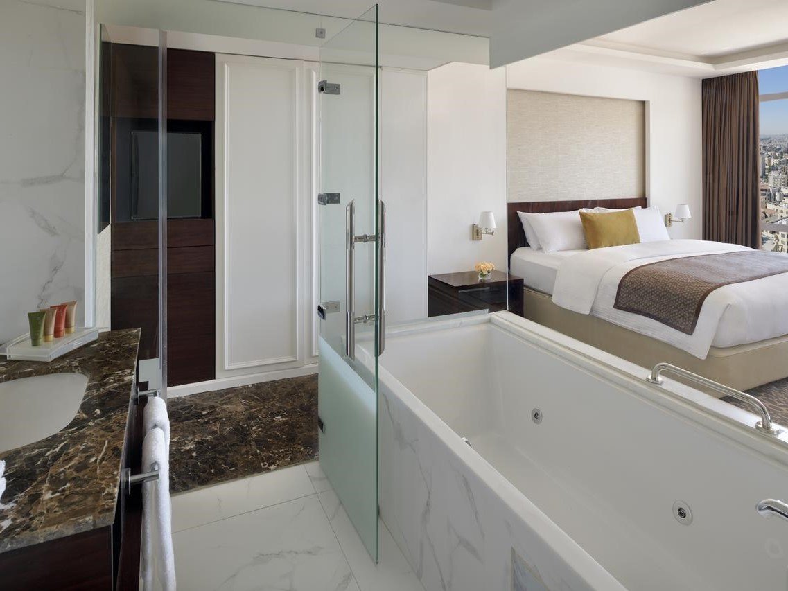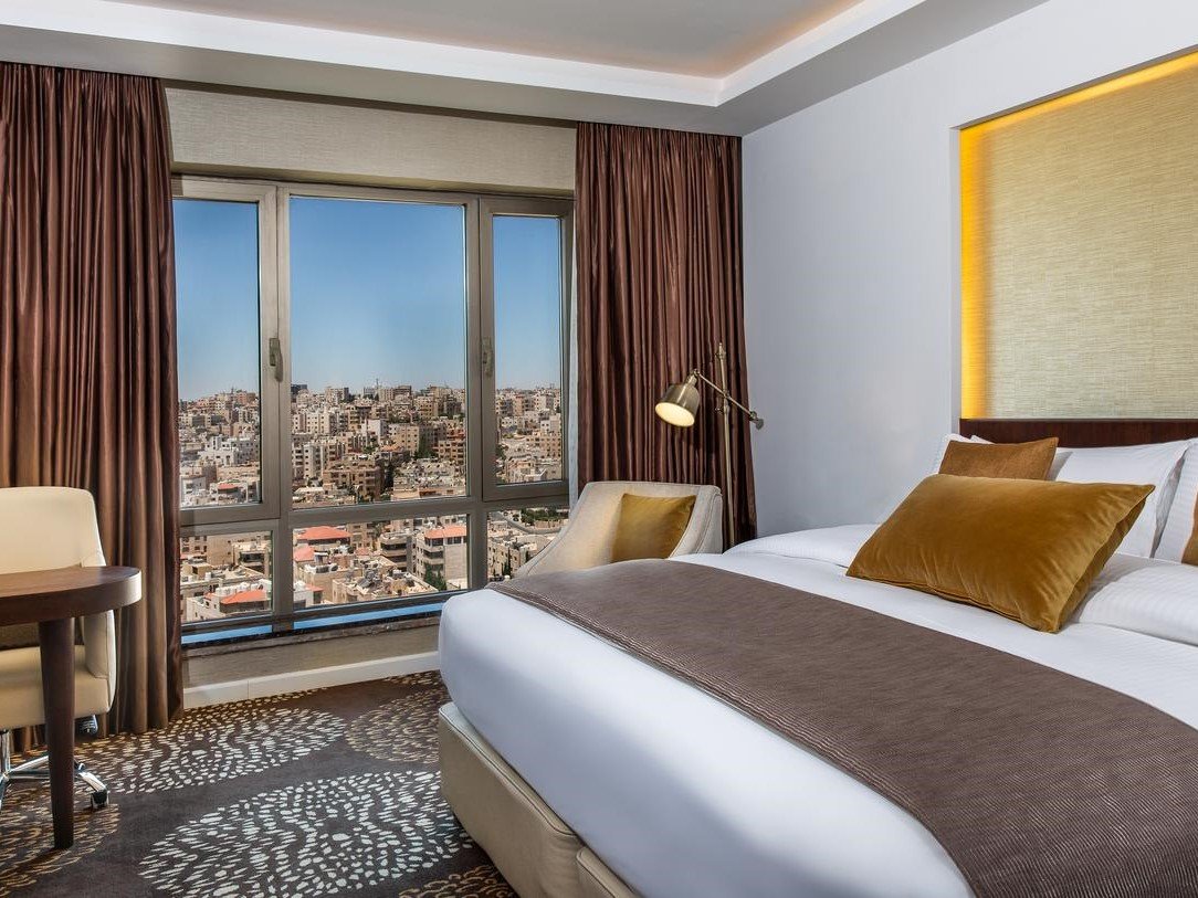 Stay at Mövenpick Hotel Amman to benefit from a great location, excellent food and wonderful Jordanian hospitality. Our 14-floor Amman skyscraper hotel is in the dynamic, commercial hub of Jordan’s capital – close to shopping malls and attractions, 15 minutes to downtown and 35 minutes from Queen Alia International Airport. Unwind in the health club, swim laps in the pool or work out in the fitness centre. Keep in touch with free Wi-Fi in all 218 rooms and suites. Business travellers and sightseers alike will enjoy the treat of executive lounge access. For meetings and events in Amman, we offer 8 incredible venues, including a ballroom for up to 1,200 guests. At Mövenpick Hotel Amman we guarantee you comfort, a memorable stay and a high standard service you would expect from our 5 star hotel. Relax and unwind in your room with high-speed Internet or take advantage of the 24-hour room service menu. Rooms are categorized as Classic Rooms, Superior Rooms, Executive Rooms, Suite, Executive suite, Presidential suite. Step into The Senate, our all day dining restaurant at Mövenpick Hotel Amman. Savour a meal in a welcoming environment with elegant furnishings. Take a seat by the floor-to-ceiling windows and start your day with the delicious breakfast buffet. For lunch or dinner, choose from a mouth-watering selection of international, American, European and Mediterranean dishes. Relish the extraordinary views from our luxurious dining venue, Rumors Lounge. Featuring a panoramic terrace with umbrellas for shade, this contemporary international restaurant at Mövenpick Hotel Amman provides the ideal setting for a business lunch, social dinner, or celebratory meal. A shisha menu is available too. Watch the latest sporting action and share a toast during happy hour at The French Quarter, featuring a laidback Louisiana feel and a pub menu filled with American favourites. This sports bar at Mövenpick Hotel Amman stays open until late at night, making it a great place for night owls in Jordan’s capital. Meet up, chill out, or sink into a comfortable armchair after a day of meetings or sightseeing. Cappuccino Lounge is a relaxing space in the lobby of Mövenpick Hotel Amman, ruled by soft colours and contemporary furnishings. It is the ideal spot to enjoy that must-have coffee or a chilled juice, alongside hard-to-resist cakes and freshly baked pastries. Swim laps, soak up some sun, or simply relax in the outdoor swimming pool. If you wish to take a more fitness related approach, the gymnasium is equipped with a treadmill, stair climber, rowing machine, elliptical machine, bikes, free weights, lockers, changing rooms and a water cooler. Unwind in separate saunas and steam rooms for ladies and gents. Enjoy a relaxing massage, reflexology session or beauty treatment after a busy day of meetings or a successful sightseeing session.