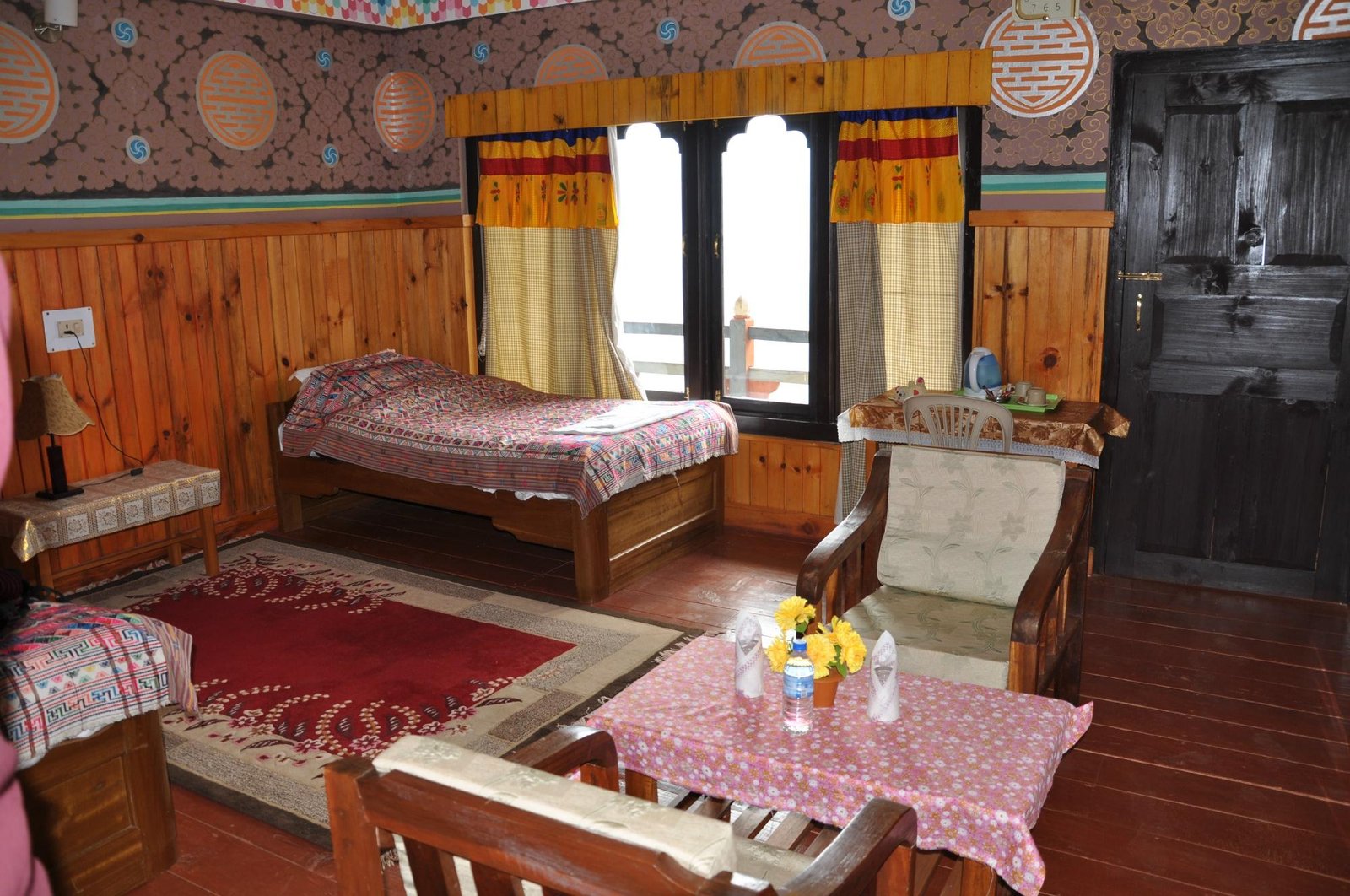 Situated on a steep slope, about 3 km drive from Trongsa downtown, the lodge is remarkably positioned offering scintillating scenery of Trongsa Dzong, Ta Dzong and the Black Mountains. The guests keen on walking tours, can follow the footpath below the lodge directly down to Ta Dzong and to the town, enjoying the nature and magnificent view all around. Established in 2001, Phuenzi Guest House is one of the first tourist friendly lodge in Trongsa. Surrounded by lush evergreen forest, since its creation, it has been a hotspot for nature lovers and bird watchers. The guesthouse also has a simple yet beautiful garden where guests can find seasonal variety of flowers, vegetables and fruits. The establishment offers colourfully presented 32 rooms segregated in Standard (17 rooms) and Deluxe (15 rooms) categories with great views of Trongsa Dzong, Ta Dzong (Museum) and the deep valley of Mangde Chhu, surrounded by black mountains of Jigme Singye National Park. Spacious deluxe rooms are preferable owing to its size and eagle-eye view of Trongsa attractions while standard rooms are relatively smaller but still cosy and similar views from balcony. The lodge boasts tastefully decorated restaurant displaying the arts & crafts of the region and serving quality Bhutanese, Indian and Continental cuisine. Adjacent to the restaurant is cozy coffee room, which the guest use to read over tea, conduct discussions or exclusive celebrations like birthday, anniversary etc. The balcony at the restaurant is a haven for photographers to capture pristine views all around. The bar, well-stocked with local & imported beverages is charming place amidst authentic Bhutanese ambience. The other facilities and amenities at lodge include: rooms with attached bath and running hot & cold water, heating, tea / coffee maker in room, Wi Fi, Currency exchange, Gift shop, Laundry service, Luggage storage, Mini library, Yoga & meditation room, traditional hot stone bath.