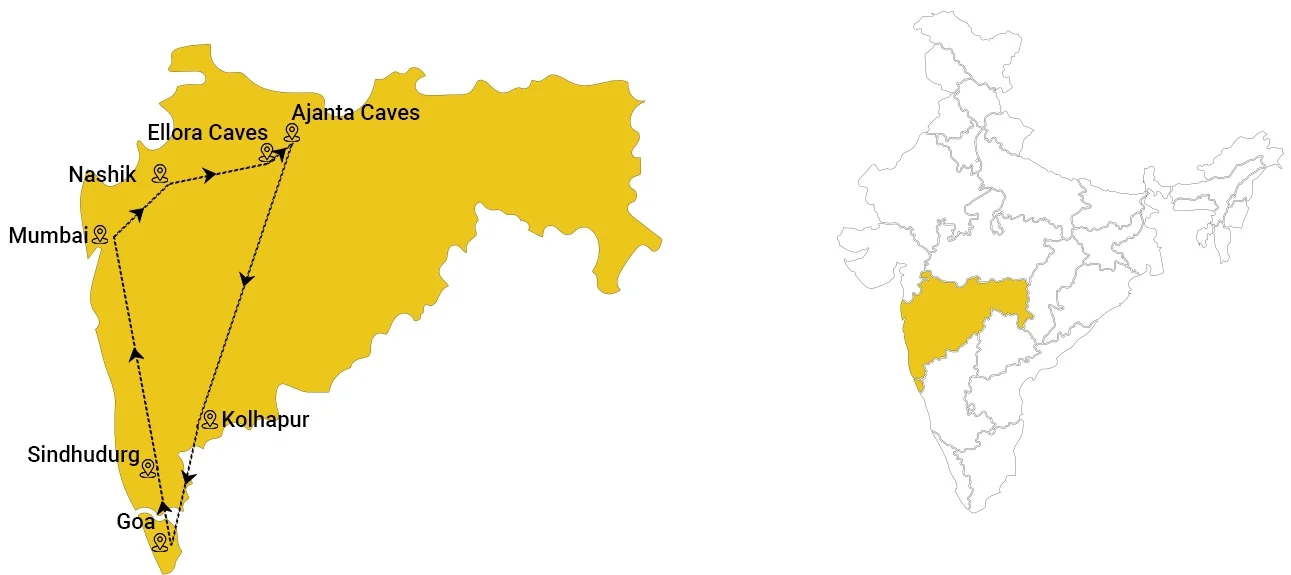 Embark on an 8-day royal journey through India’s most beautiful destinations. This itinerary includes visits to the Wine capital of India, Nashik, the colorful city of Kolhapur, India’s party capital, Goa, Aurangabad, and Jalgaon, renowned for housing the UNESCO World Heritage Sites of Ajanta & Ellora Caves, as well as the rocky island of Sindhudurg. Get ready to experience the vibrant and colorful side of India in regal style.