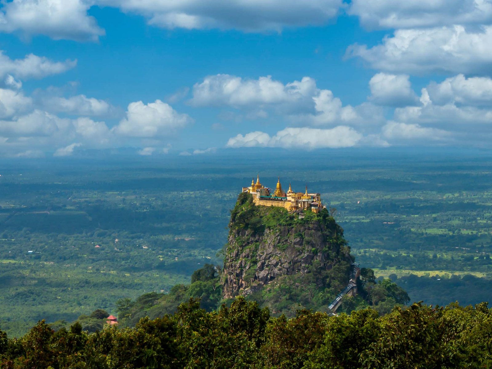 Morning: After breakfast, drive to Mount Popa, located about an hour from Bagan. Rising 4,981 feet above sea level, Mount Popa is considered the center of Nat worship (mystical spiritual beings) and the core of an extinct volcano, often referred to as the “Oasis” of the dry zone. Visit the towering volcanic plug, home to a picturesque complex of monasteries and Nat shrines, accessible by climbing 777 steps. After exploring Mount Popa, return to Bagan.
